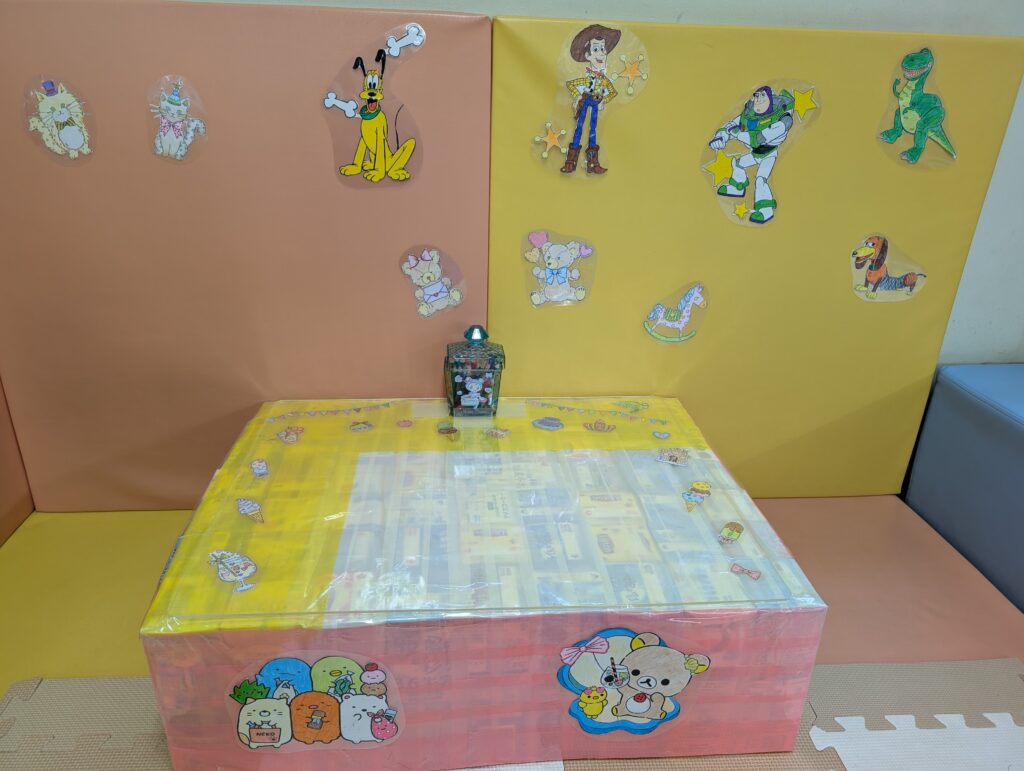 職員が持ち寄った牛乳パックで机と滑り台を作りました。